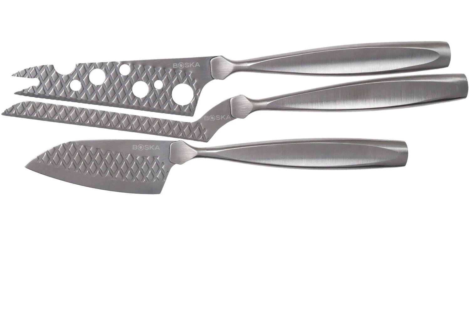 Ce Boska Monaco+ Set couteaux à fromage offre une solution pour couper tous les types de fromage. L’ensemble contient trois couteaux différents, adaptés à la découpe de fromages à pâte molle, semi-dure et dure. La coupe du fromage est un jeu d’enfant grâce au design superbe et surtout fonctionnel, associé à des coupes nettes.