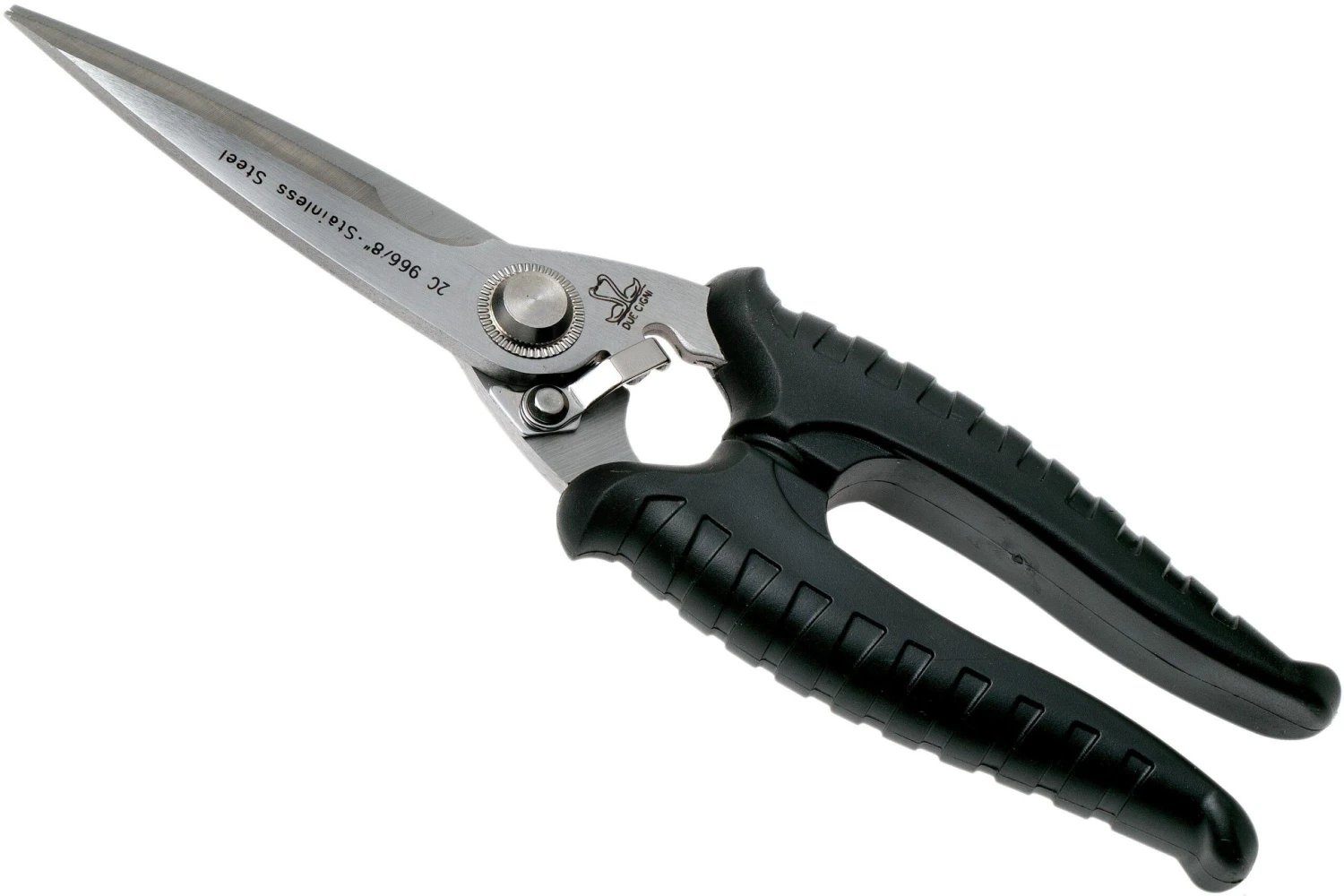 Cette paire de ciseaux de cuisine Due Cigni est dotée de micro-dentures. Vous pouvez donc couper différents types de tissu, dont ceux plus épais ou avec plusieurs couches, comme le denim et le cuir. Grâce aux micro-dentures sur un côté, vous êtes certain de toujours couper droit. Cette paire, par contre, est assez grande et robuste pour couper de la volaille.