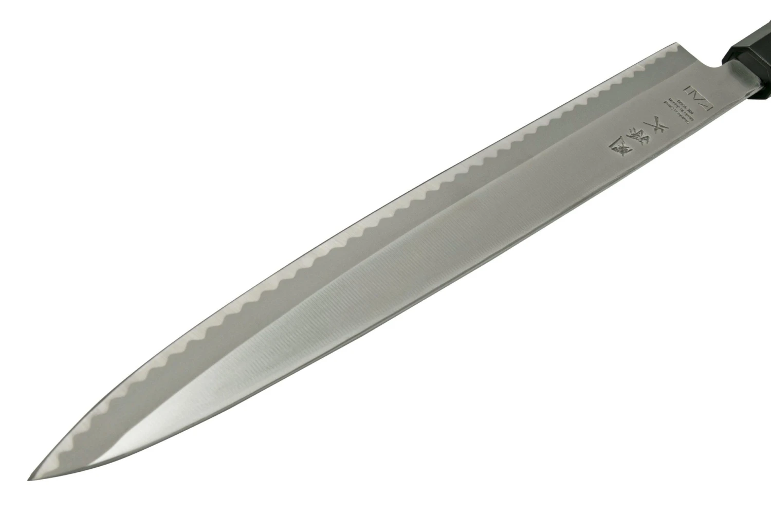 Le Yanagiba 30cm Kai Seki Magoroku KK est un couteau à sashimi japonais. Ce couteau a une lame extrêmement longue et fine, qui permet de couper de façon très fine et précise. Il convient donc particulièrement pour la préparation du poisson. La lame ne nécessite que peu d’entretien, et elle conserve longtemps son tranchant. Les lignes ondulées satinées sur la lame sont très esthétiques.