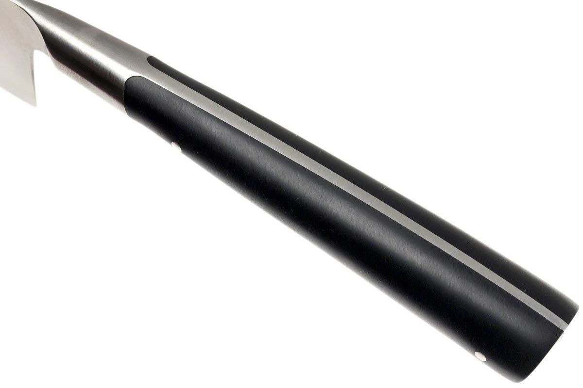 Le santoku Lion Sabatier Edonist noir est la version japonaise du couteau de chef. Sa lame est légèrement plus courte et plus large que le couteau de chef européen. Santoku signifie ‘trois qualités’ en japonais. Pour certains ces qualités seraient : couper, concasser et ramasser. Tout ce dont ce couteau est capable. Pour d’autres, il s’agirait de : viande, poisson et légumes. Les trois ingrédients que le santoku coupe avec panache. Les alvéoles de la lame empêchent les ingrédients de coller à celle-ci. Un effet antiadhésif dont on profite particulièrement lors de la coupe de tranches très fines. Le santoku nécessite une technique de coupe particulière. En effet, celui ne bascule pas sur la surface de coupe mais se déplace en diagonale dans les aliments en partant du haut vers le bas. Lors de la coupe, le couteau est constamment à l’horizontal.