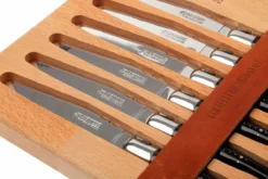 L’Opinel facette est une collection de couteaux fabriquée en France. Les modèles de cette collection sont disponibles dans différents coloris. L’Opinel facette mix box se compose de quatre couteaux de table avec une lame en acier inoxydable en pleine soie et un manche fait de différents matériaux. On y trouve un manche en bois d’olivier, avec des lignes irrégulières et une teinte jaune orangée. Le manche blanc du second couteau est fait en papier pressé écologique. Le manche du troisième couteau est fait en bois de frêne clair, d’une couleur beige à blanche, avec des lignes subtiles. Le quatrième couteau a un manche foncé, fait de frêne sombre.