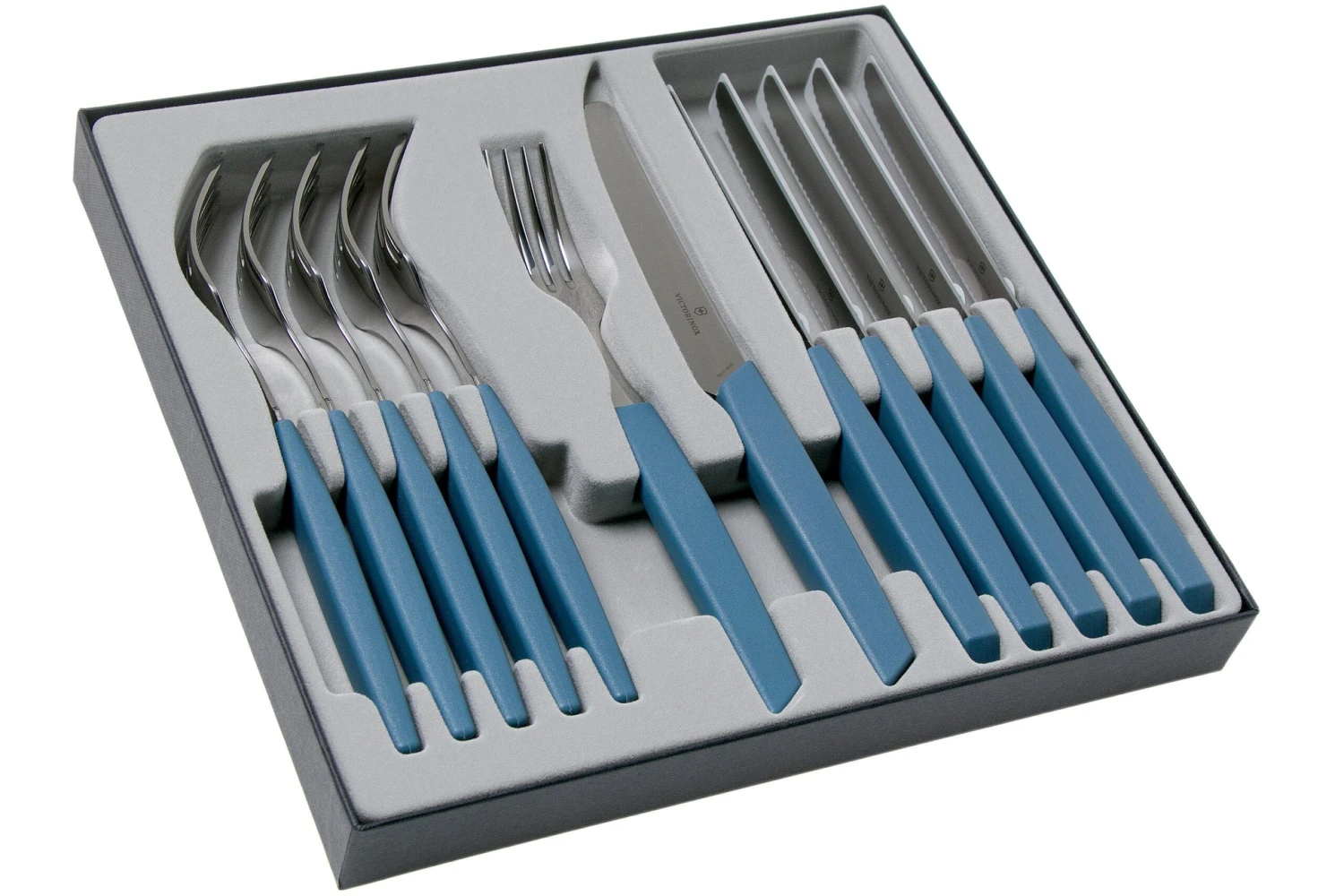 Le set de couverts Victorinox Swiss Modern 12 pièces se compose de de 6 couteaux dentelés et de 6 fourchettes, tous avec un manche bleu. Les couteaux de table de cette ménagère sont en réalité des couteaux à tomates. La lame dentelée du couteau à tomates permet de trancher la peau d’une tomate sans avoir à exercer trop de pression. Ainsi on n’abîme pas les tomates. Le couteau à tomate présente une pointe arrondie, contrairement à un couteau à steak, par exemple. Bien sûr, ce couteau peut tout aussi bien servir à couper de la viande, du poisson, des légumes, des fruits et du pain. Parfait pour une utilisation quotidienne.