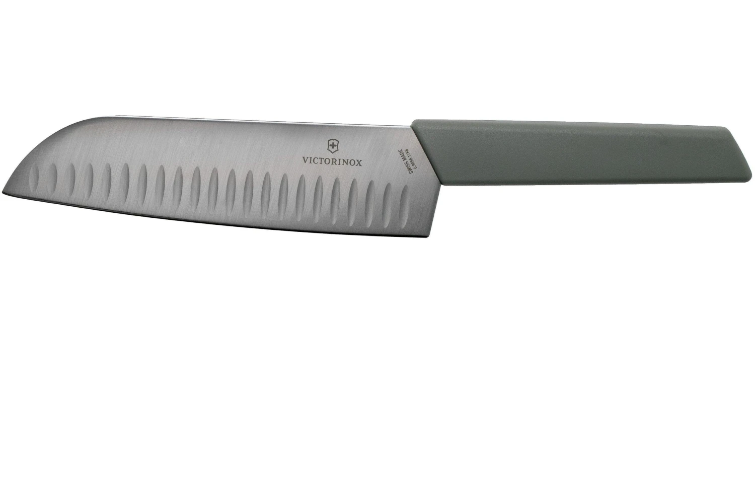 Le couteau santoku Victorinox Swiss Modern est à l’origine un couteau de chef japonais. On utilise ce type de couteau au Japon essentiellement pour préparer les Sushis. On remarque les alvéoles sur la lame. Elles permettent d’éviter aux aliments d’y coller. Ce détail est particulièrement pratique lorsque l’on coupe des tranches. Ce couteau est indispensable dans toute bonne cuisine.